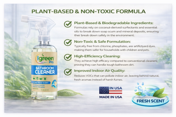 A naturally derived ingredients bathroom cleaner was prepared to clean your bathroom and leave it with clean look and fresh scent. It is effectively removes soap scum and stains with the power of IGreen Pro foam and without any harsh chemicals